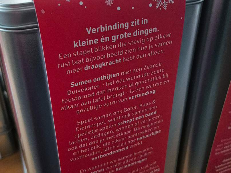 Van een stapel stevige blikken -samengehouden door een feestelijke banderol- tot samen ontbijten met een Zaanse Duivenkater, van een potje boter, kaas & eieren spelen met magneten die elkaar aantrekken. Het zijn de momenten samen die we allemaal koesteren en graag delen.