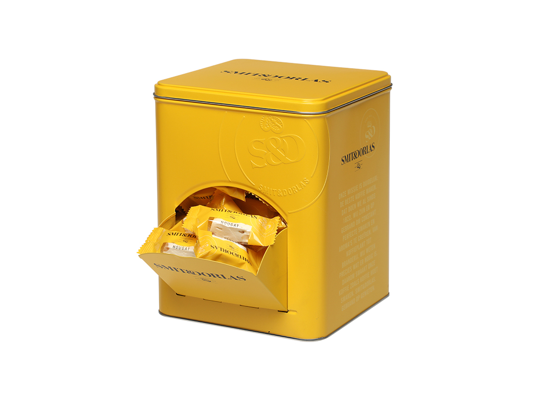 We ontwierpen een universeel inzetbare dispenser die direct klaar was voor gebruik (Ready to Use Packaging). Door aan de voorzijde te kiezen voor een klep die open kon blijven staan, konden de koffiebenodigdheden of zoetwaren er zo uitgepakt worden. Het blik kreeg de kenmerkende gele bedrijfskleur en werd in de productie op moderne wijze afgewerkt.